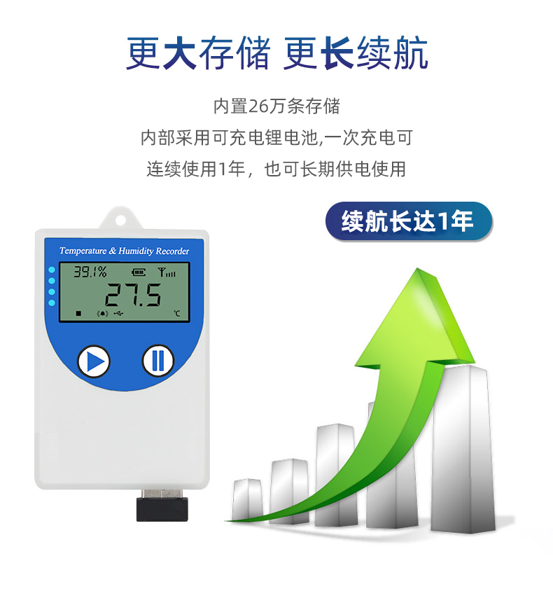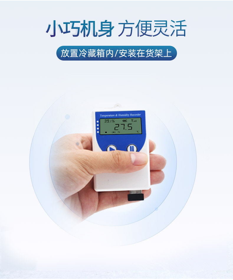 為方便各種場(chǎng)景的使用,智能溫濕度記錄儀分為內(nèi)置探頭型和外延探頭型,內(nèi)置探頭型適用于普通環(huán)境使用,外延探頭型適合在高濕度的場(chǎng)合使用,探頭線可延長(zhǎng)至30m。