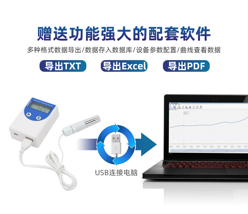到達(dá)目的地后,智能溫濕度記錄儀可以通過(guò)USB線連接電腦,配合配套的軟件可以將設(shè)備中已存儲(chǔ)的數(shù)據(jù)以EXCEL/TXT/PDF等格式導(dǎo)出到電腦,以供接收方查看運(yùn)輸過(guò)程中的數(shù)據(jù),方便后續(xù)報(bào)表制作及數(shù)據(jù)分析。