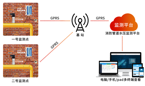 建大仁科消防管道壓力監測系統通過GPRS數據采集器將壓力傳感器的監測數據傳輸到消防管道水壓監測平臺,實現壓力數據異常告警,并對整個消防水系統運行情況進行在線監測、綜合分析,可快速定位消防管道中存在的故障點,并通過短信、微信、郵箱等推送報警信息給到相關管理人員,對消防管道的故障或報警問題進行及時處置,降低了消防隱患,確保消防水系統在火災發生時能發揮真正的作用。